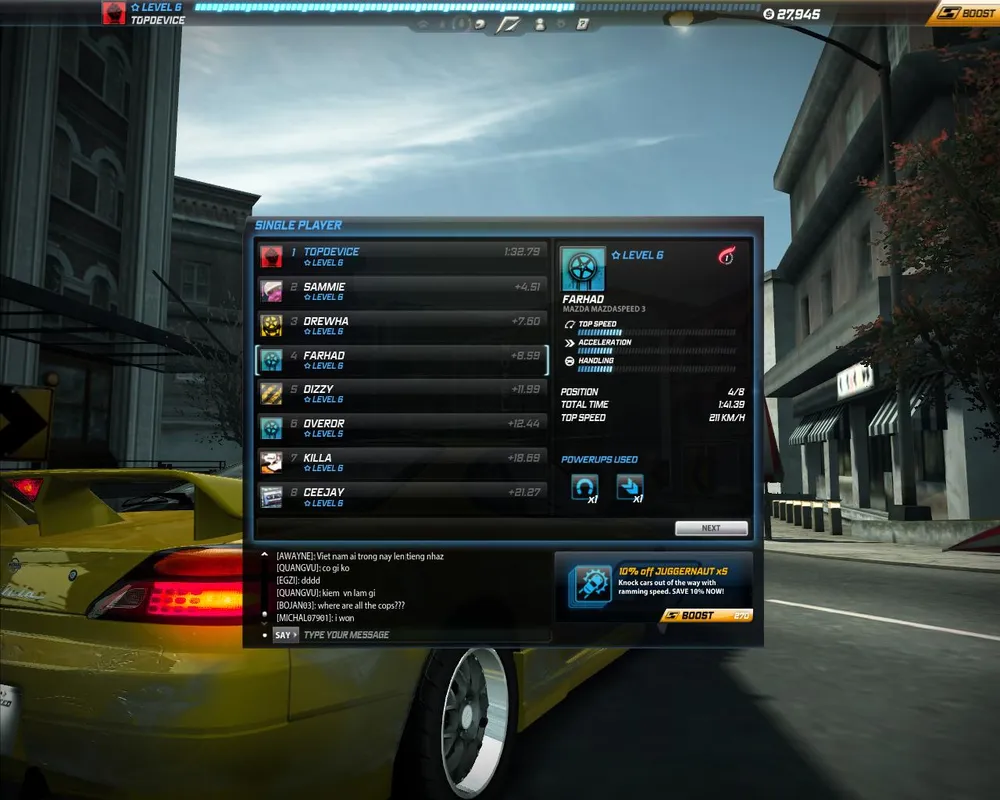 При окончании гонки мы можем посмотреть свое время / время противников, использованные нами и противниками бонусы.