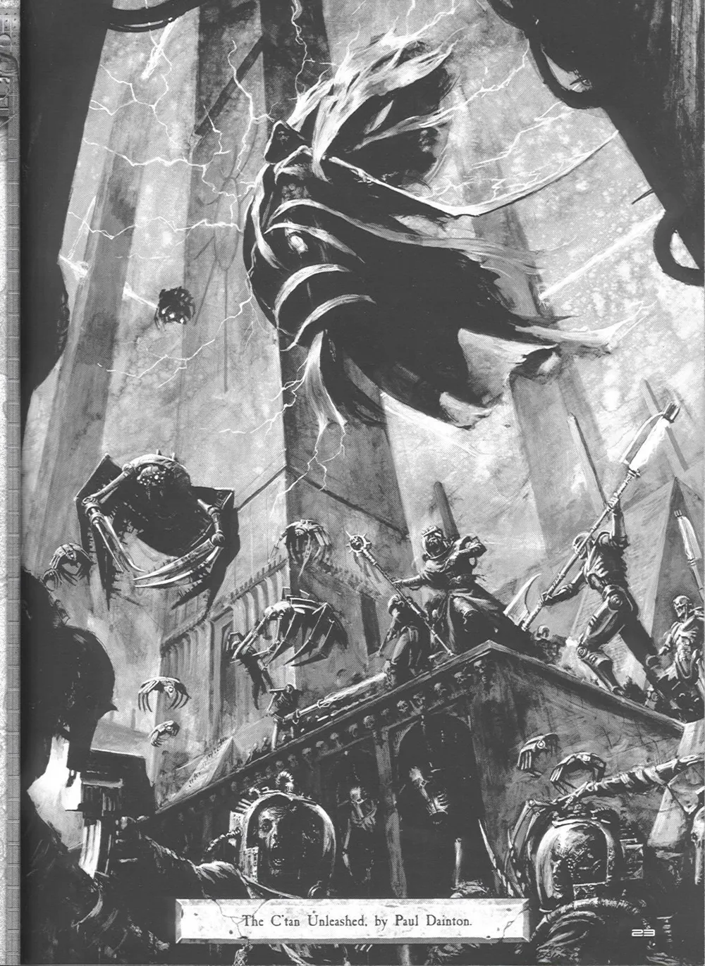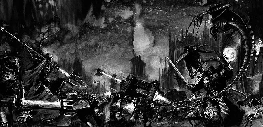 Ведомые жуткими К’Тан, Звёздными Богами, некронтир устроили настоящую жатву, опустошая целые звёздные системы. Даже когда эльдарский бог войны Кроваворукий Хайн сумел убить одного из К’Тан, шансы эльдар всё равно оставались призрачными – они не могли справиться с не боящимися смерти некронтир и принявшими облик жутких существ из живого металла К’Тан, выкашивающими целые армии. Как считают сами эльдары, спасение им пришло в лице Арлекина, Смеющегося Бога, который сумел обмануть К’Тан и заставить их уничтожать друг друга, а выживших – пленить. Лишённые божественного руководства некронтир утратили цель и погрузились в стазис, на много веков похоронив себя в титанических гробницах. Война закончилась сама собой и победивших не было – эльдар так и не смогли окончательно оправиться от Жатвы некронтир. Но они всё же сочли, что эта угроза миновала. Они ошиблись. Ошиблись во всём.