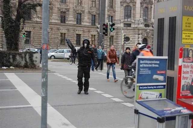 Хелгаст, как единственный актёр пиар агентства, был разоружён: его попросили предъявить права на автомобиль, снять маску и шлем и убрать игрушечный ствол. Его быстро проверили, а тем временем количество рядом находящихся полицейских возросло до пяти. В конце концов, счастливый и улыбчивый, хелгаст был отпущен, но полицейские настоятельно попросили в следующий раз не приносить в центр города противогаз и игрушечное оружие.