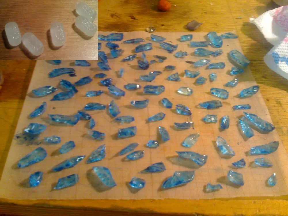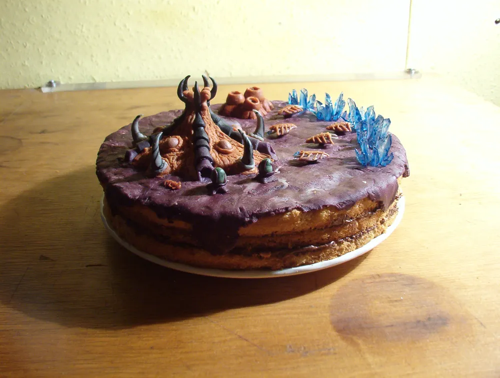 Ввобщем это чудо вполне сьедобно. Используется обычный торт или коржи. Абсолютно вся база сделана из марципана которая разукрашена пищевой краской. Единственное что не из марципанов так это минералы. Для них были взяты белые леденцы которые потом разукрасили в синий опять таки пищевой краской. Если найдете сразу покупайте голубые леденцы. Остальное все это ваша фантазия и умения...