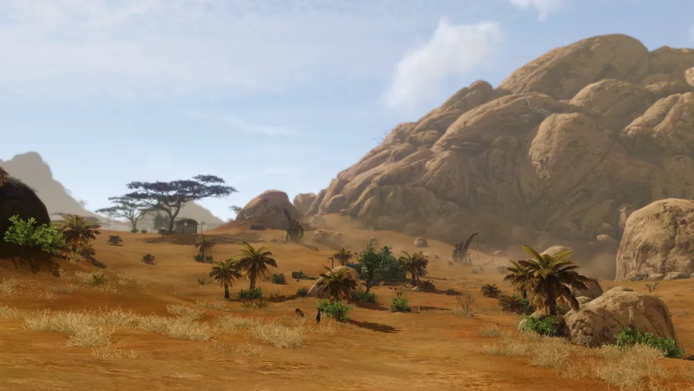 Но вернемся к стартовой локации. Климат здесь несколько отличается от привычного живущим неподалеку ферре — более сухой, приближенный к пустынному. Тут пыльный воздух, яркое солнце и очень резкие тени.
