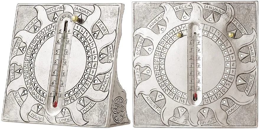 Этот очень стильный настольный календарь из олова создан вручную мастерами из северной Италии. Чтобы обозначить дату, переставьте прилагаемые гвоздики в нужные отверстия. В середину пластины вставлен комнатный градусник. Календарь существует в настольном и настенном варианте.