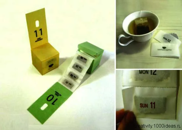 Новый сорт каждый день. В небольшой коробке в виде кухонного стула свернута «лента» пакетиков с датой — например, в четверг 25 июля вы пьете зеленый чай с розой, а в понедельник 16 декабря — черный с апельсином. На серых прямоугольниках указаны только месяц и день — чай какого сорта и из какой страны будет в вашей кружке, выяснится только тогда, когда вы зальете безликий пакетик кипятком. Идея Чо Хи Ха (Cho Hee Ha).