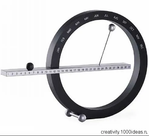 Он был придуман дизайнером Максимом Бирюковым, который объединил календарь с часами. Месяцы, числа и дни недели расположены по кругу, причем есть отметки праздничных дней. Большая стрелка показывает текущий месяц и число, совершая полный оборот за 365 (в 2009 году) дней, а маленькая отображает день недели и час – она совершает полный оборот за 7 дней.