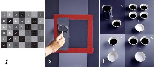 4) Для получения цвета как у квадратов, обозначенных буквой B, смешайте 4 части чёрной краски с 1 частью белой (см. рисунок 3). После покраски квадратов удалите малярную ленту и дайте им высохнуть около часа.