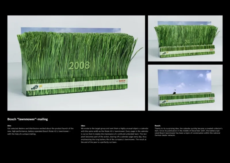 Этот календарь был разработан для рекламы газонокосилок и сделан в виде заросшего газона. Каждый день отрывая очередной листок календаря, мы словно подстригаем его.