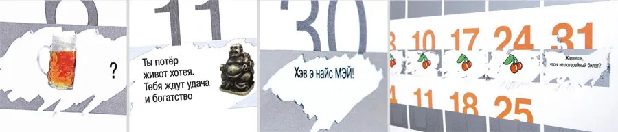 Имеет такой же принцип, но даты не исчезают бесследно – под ними содержатся шутки, советы, весёлые картинки, ребусы, загадки, интернет-ссылки и размышления календаря о жизни, дружбе и любви. И всё это не просто так, а сообразно историческому моменту, в контексте конкретного дня. Внизу имеется магнитная плоска с 5-копеечной монеткой, чтобы было удобнее стирать защитные слои.