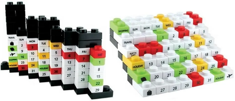Кубики этого календаря вы сможете сгруппировать как угодно, и к тому же отметить важную дату специальной фигуркой. Набор состоит из 77-и лего-кубиков с числами, днями недели и месяцами, причем выбирать им цвета вы сможете сами.