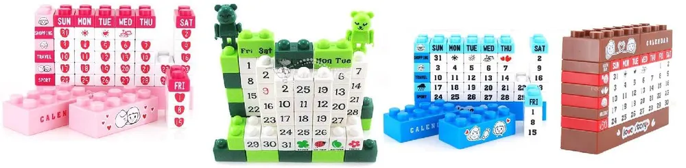 Этот календарь состоит из трёх кубиков Lego: белого, красного и жёлтого цветов, которые отображают соответственно день месяца, день недели и месяц. Чтобы сменить дату, достаточно нажать кнопки на верхней поверхности кубиков. В этом календаре не задается год, поэтому его можно использовать очень долго.