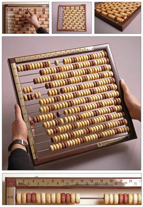 Каждая спица в календаре соответствует одному месяцу, а костяшка - одному дню. Чтобы «отметить» прошедший день, необходимо переместить соответствующую костяшку из правой части в левую. Календарь рассчитан на один год но для того, чтобы пользоваться им и дальше, достаточно просто пересобрать костяшки на каждой из спиц.