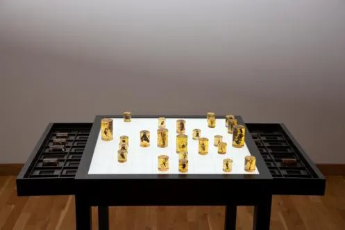 Материалы: мореный дуб возрастом 5000 лет, стекло, медь, янтарь, смола, насекомые.