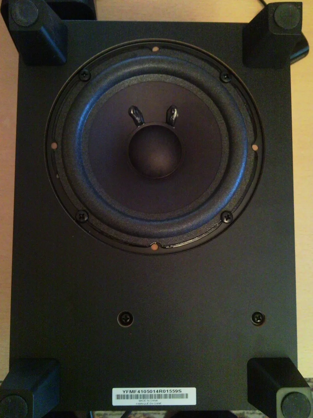 Так как мощность его не велика (20 ватт), то и размеры соответственно малы. Никаких индикаторов, дисплеев, "крутилок" на лицевой стороне нет, сразу видим - из "эконом" класса. Видим мы только отверстие, откуда "выбивается" воздух (к своему стыду, не знаю, как правильно его назвать) и эмблему "Креатива". Все. Строго. Мне нравится. С обратной стороны саба чуть повеселее: видим регулятор басов, пять каналов для сателлитов с пометками куда что втыкать (к слову, в комплекте идут наклейки для размещения их по колонкам с пометками "правая передняя", "левая задняя" и т.п.). Выходит из сабвуфера провод питания, пульта управления и провод для подключения акустики к звуковой карте (о последних двух поговорим отдельно). На нем же находится включатель/выключатель всей системы. Сам излучатель низких частот расположен снизу саба. Смотрим фото.