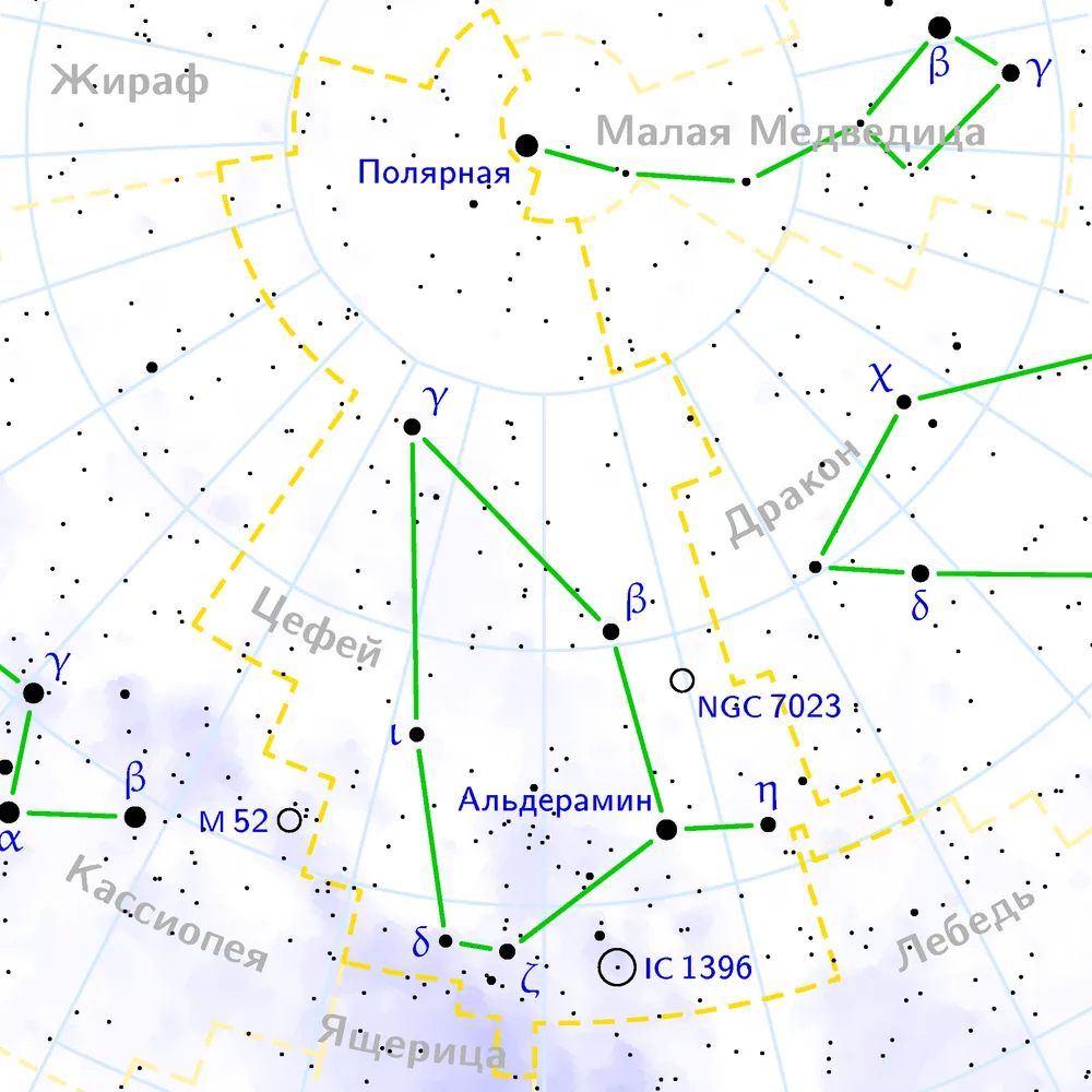 Созвездие носит имя эфиопского царя Цефея (мужа Кассиопея, отца Андромеды). Название созвездий Цефея, Кассиопеи, Андромеды, Кита, Персея взаимосвязаны и посвящены участникам и основным действующим лицам мифа. Персей спас Андромеду, которую боги велели принести в жертву морскому чудовищу – Киту, дабы избавить Эфиопию от ежедневных бедствий. Цефею, как заботливому правителю пришлось согласиться со столь ужасной долей. А первопричиной появления бедствий – явилось хвастовство Кассиопеи. Альдерамин является наиболее яркой звездой, а полюбоваться красотой созвездия можно на всей территории России, поскольку оно расположено в Северном полушарии. Наиболее приемлемые условия наблюдения в конце лета – начале осени.