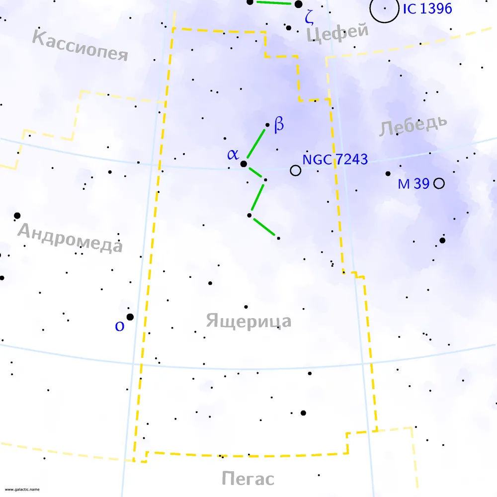 Относится к новым созвездиям и датой введения считается конец 17 века. Это созвездие размещено между давно открытыми, и со слов автора, на том участке небосвода, что занимает созвездие ничего крупнее ящерицы просто не поместилось бы. Несмотря на то, что созвездие новое, наблюдать его можно со всей территории России, поскольку оно принадлежит северному полушарию. Почти все входящие в состав созвездия объекты слабые и рассмотреть его можно только при благоприятных для наблюдения условиях и преимущественно в конце лета, начале осени.