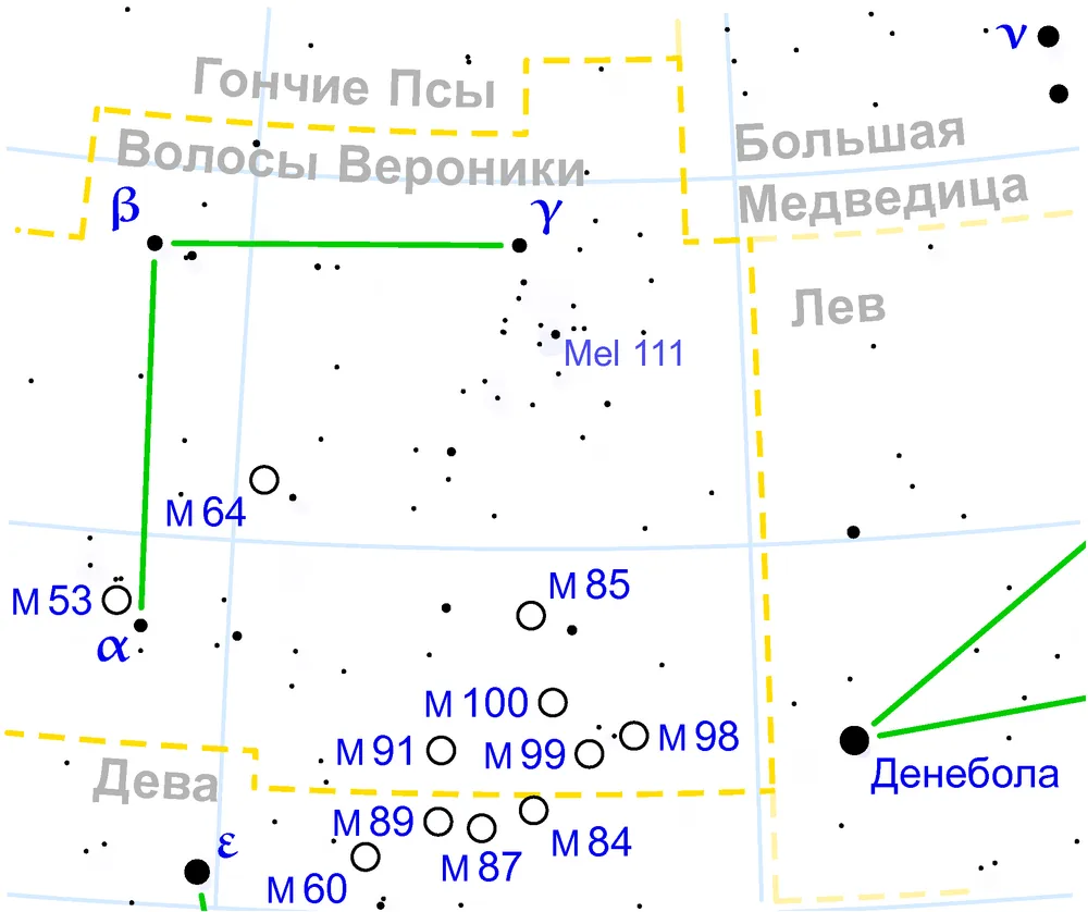 Вероника была женой Птолемея III – фараона Египта. Краше самой Вероники считались только её волосы. Именно их она и принесла в жертву Афродите, дабы та помогла Птолемею одержать победу над врагами. Согласно мифу Афродита поместила эти волосы на небосклон, чтобы все могли любоваться их божественной красотой. Особо ярких звезд в данном созвездии нет, тем не менее, оно неплохо просматривается в наших широтах в начале и середине весны.