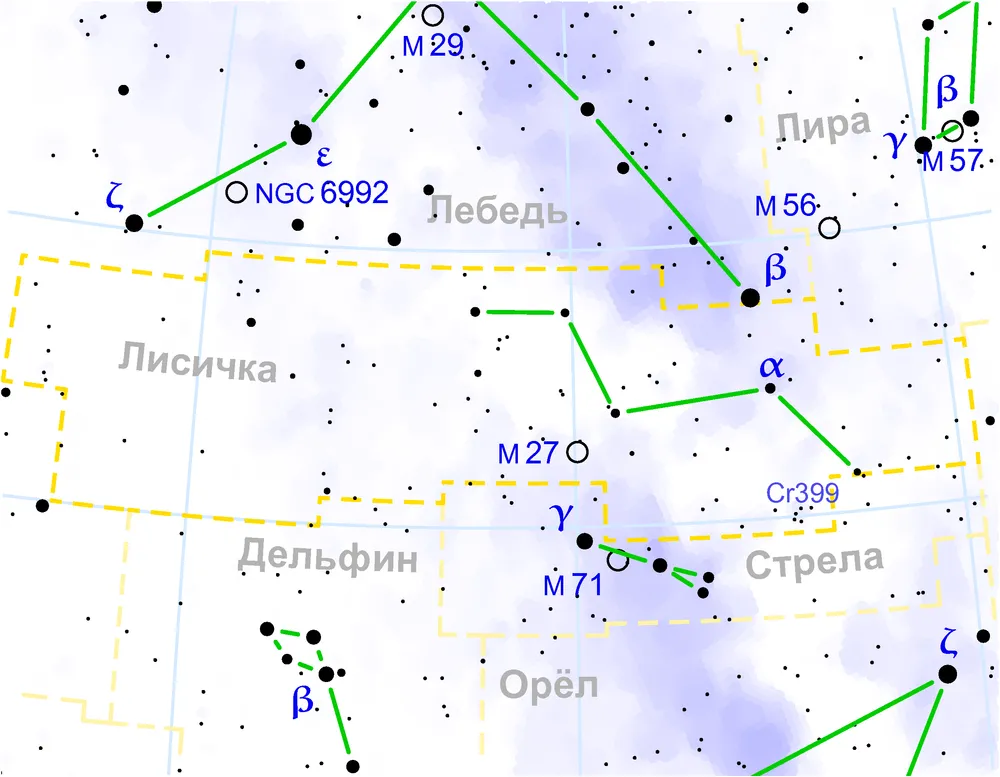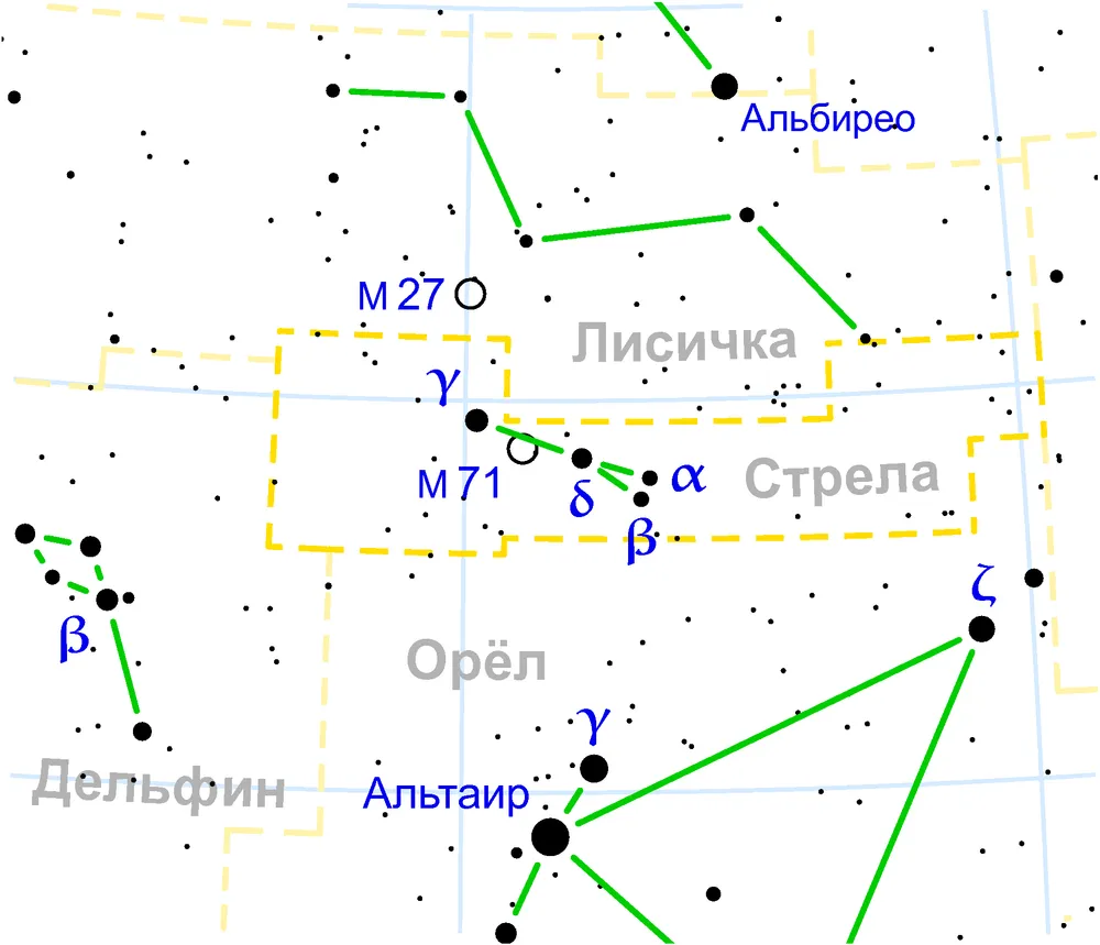 Принадлежит к новым созвездиям и датой его возникновения в современном виде считается конец 17 века. Обычно изображается в виде лисицы, держащей в зубах свою добычу – гуся. По одной из версий конкретным персонажем для созвездия послужила Тевмесская лиса, которую боги наделили хитростью и сделали неуловимой. Несмотря на то, что это довольно тусклое созвездие, без особых проблем его можно наблюдать со всей территории России лучше всего в августе.