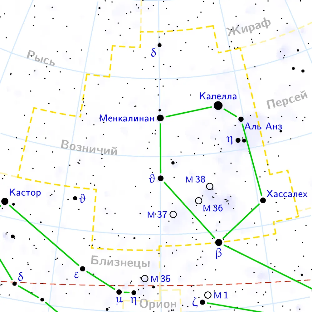 Однозначной трактовки, кто являлся прообразом изображённого персонажа в созвездии нет, в качестве версий были и боги, и цари, и другие герои. А само созвездие получило название из-за тесного соседства с другим древним созвездием «Коза» с несколькими небольшими звёздами рядом, именуемыми «Козлятами» которое постепенно и сформировало известного сейчас «Возничего». В память об этом, персонажа возничего изображают с козой на спине и козлятами на левой руке. Капелла – наиболее яркая звезда. Наблюдать можно со всей территории России в зимний период.
