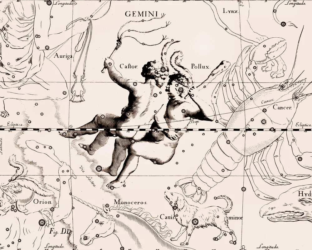 Созвездие включает в себя 8 звезд, но наиболее яркими из них являются Поллукс и Кастор. Название созвездие получило в честь детей прекрасной Леды – близнецов Полидевка и Кастора, согласно мифу именно они и поместили соответствующие звезды на небо. Созвездие относится к зодиакальным. Просматривается со всей территории России преимущественно в самом начале – середине зимы.