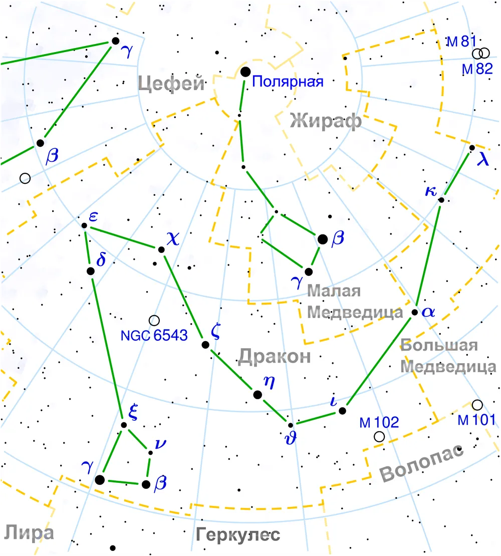 Относится к древним созвездиям, существует несколько версий по поводу того, в честь какого именно дракона названо созвездие. Согласно наиболее популярной версии полаают, что этим драконом был Ладон, тот самый, что охранял яблоню с золотыми плодами. Впоследствии этот дракон был убит Геркулесом, которому потребовались золотые яблоки. Другая версия – связана с аргонавтами и драконом Колхис, охранявшим в свою очередь золотое руно. Созвездие относится к околополярному и его можно наблюдать со всей территории России круглогодично. Наилучшие условия наблюдения будут весной. Ярчайшей звездой является Этамин.