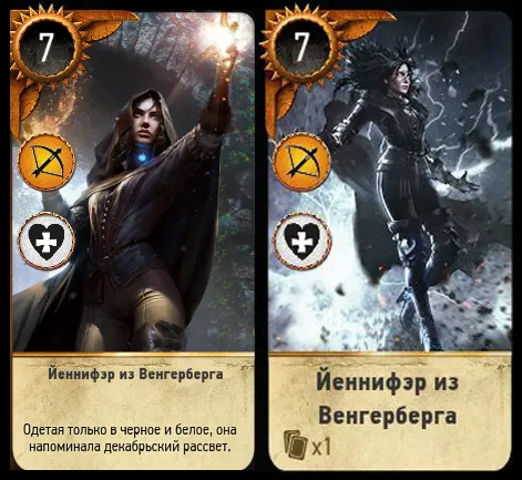 Даже в игре на картах для гвинта представлены две разные версии Йеннифэр (см. ниже), при этом версия из DLC «Герои баллад» [Набор нейтральных карт для гвинта. – Прим. перев.] больше похожа на ее финальную внутриигровую модель.