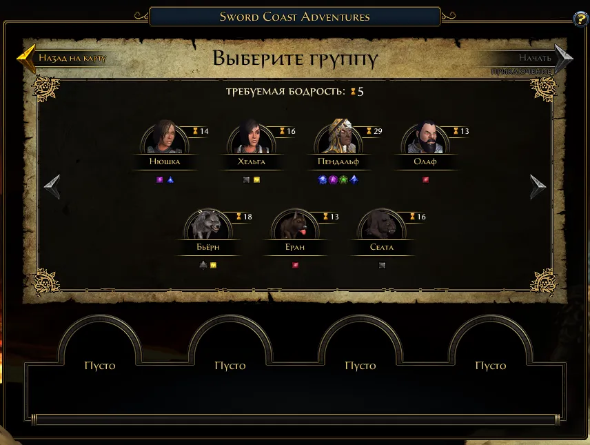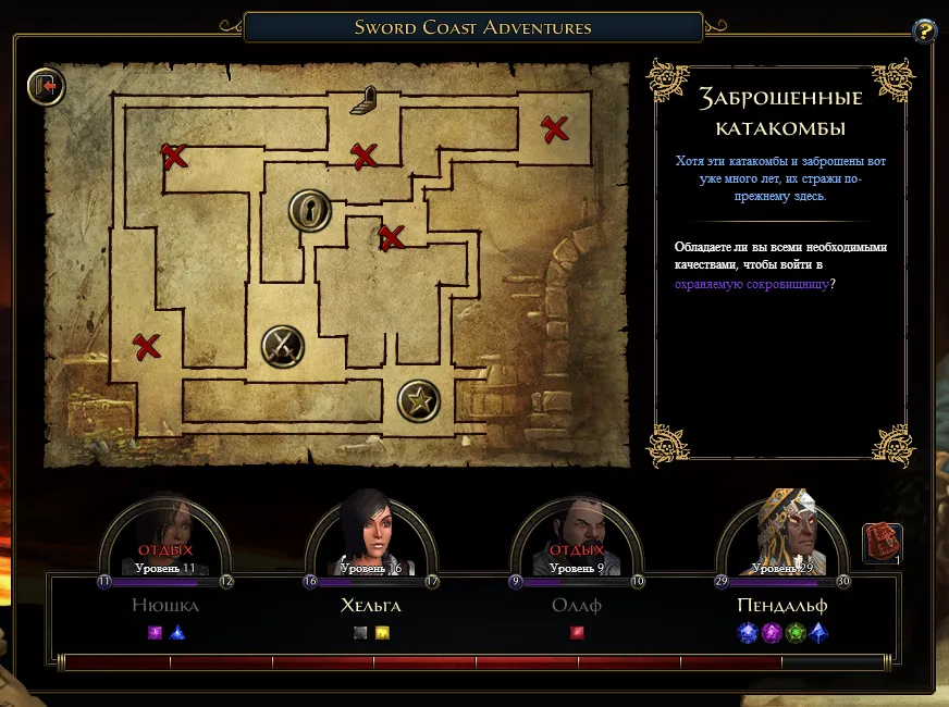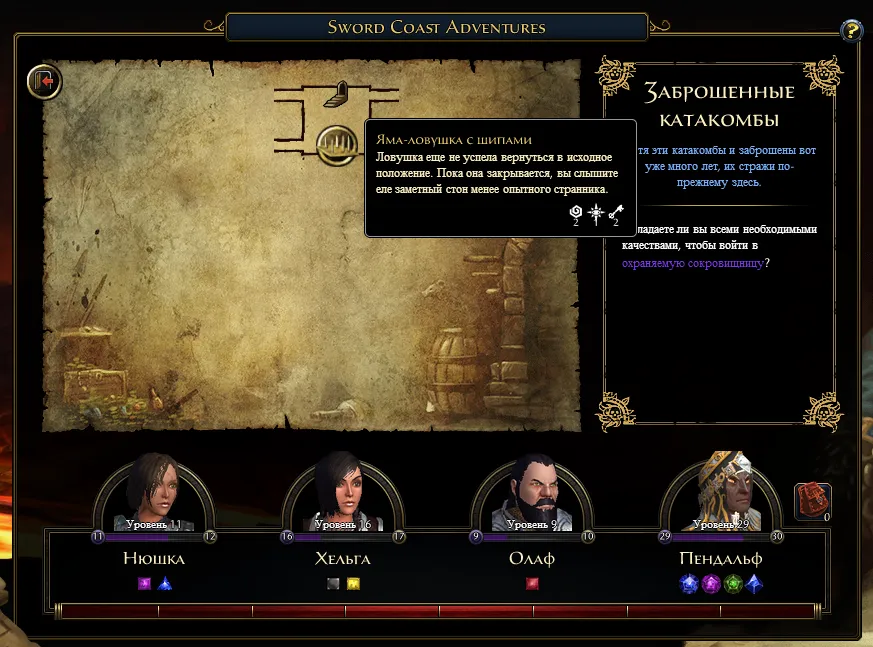 С «героями» разобрались, теперь же разберемся с испытаниями и врагами. Суть испытания проста – каждое испытание это постепенно открывающаяся карта местности, с точками, обозначающими врагов и препятствия. Если навести курсор мышки на знак препятствия или врага, то можно увидеть, какие аспекты должны выпасть для победы, и подобрать соответствующего члена отряда для прохождения.
