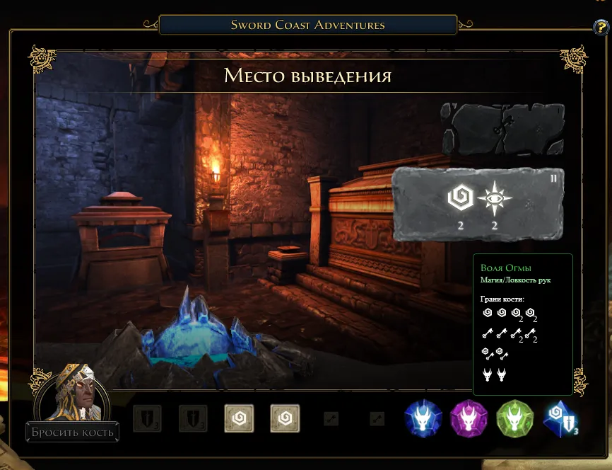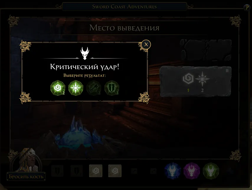 Система боя достаточно проста: спутник бросает кубики, если на одном из кубиков выпал нужный аспект, то соответствующий символ у врага отнимается, если же нужного аспекта (символа) не выпало, то, увы - это промах. В случае промаха все равно нужно выбрать кость, которая просто будет удалена впустую. И так продолжается до тех пор, пока мы не разобьем все аспекты врага, либо у нас не закончатся кости. В первом случае препятствие считается пройденным, а в последнем мы терпим поражение, и у нас отнимается одна полоска «жизни», когда кончаются все полоски – мы полностью проигрываем все испытание целиком.