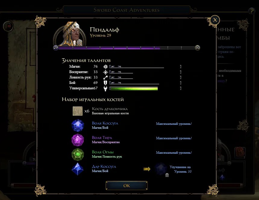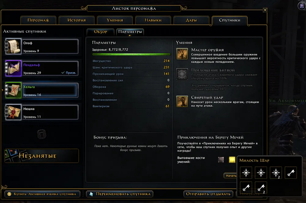 Эти параметры можно просмотреть на вкладке «Параметры спутника» непосредственно в игре, либо щелкнув по его портрету в группе о время «Приключения на Берегу Мечей».