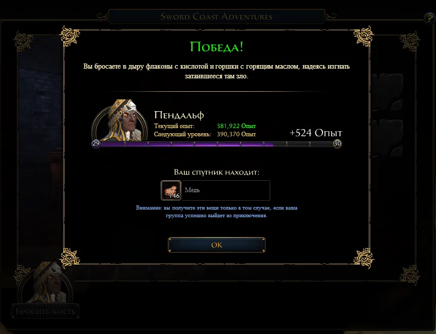 Если же мы проходим все препятствия и убиваем главного злодея (точнее сказать забрасываем кубиками до смерти), то испытание считается пройденным, и мы получаем заслуженную награду.