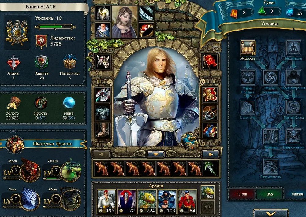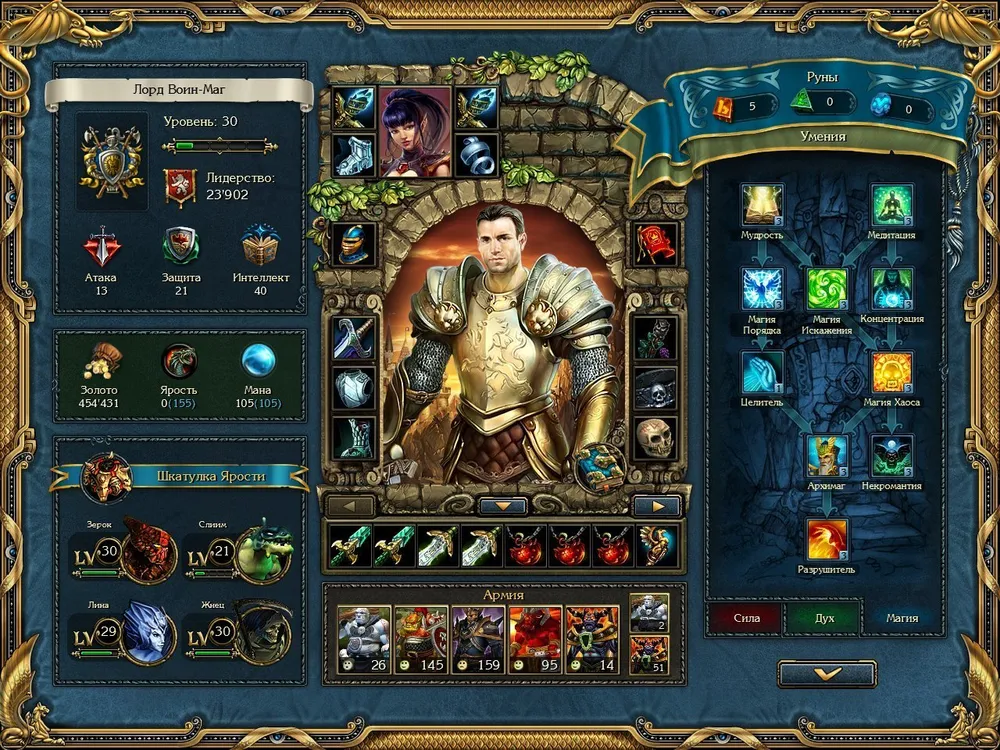 При каждом повышении уровня нашего Героя, если, среди прочего, выпадает интеллект, мана или ярость – берём именно эти показатели. В жёны лучше всего взять Ксеону – это добавит к двум оружейным слотам воина ещё два. Получившийся в результате Герой наносит страшные опустошения вражескому войску одной только Шкатулкой Ярости, а затем ещё добавляет магией. Лидерством, защитой и атакой он также не обижен – в общем, получается весьма интересный и грозный персонаж.