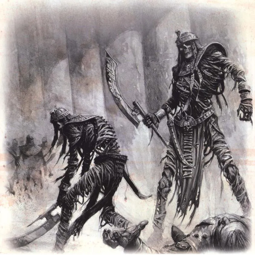4) Мумии – эти милейшие ребята чем-то напоминают зомби, но при этом куда опаснее. Думаю, все знают, что из себя представляют мумии как таковые. А вот чем страшны их неупокоенные варианты, которые часто встречаются в роли стражей различных гробниц, стоит объяснить. Во-первых, тела мумий хорошо сохраняются благодаря бальзамирующим составам и прочим особенностям погребения, поэтому они в скорости передвижения и точности действий не уступают обычному человеку, многократно превосходя по силе. Во-вторых, встреча с мумией чревата заражением особо пакостной болезнью или наложением проклятия – к охране своих ценностей аристократы и жрецы обычно подходят с выдумкой. В-третьих, мумии очень часто вполне разумны (насколько они психически нормальны – это уже другой вопрос) и поэтому способны на неожиданные хитрости и тактически грамотные действия. Да и прижизненные навыки, будь то умение владеть оружием или магией, со счетов сбрасывать нельзя. В-четвёртых, мумии благодаря пронизывающей их тела магии обладают властью над низшей нежитью, так что можно ожидать встретить и боевые отряды скелетов под их началом. Ну и в-пятых, иногда особо древние и могучие мумии способны рассыпаться тучей песка, стаей скарабеев или скорпионов и тому подобной гадостью, что прекрасно подходит и для нападения, и для спешного отступления.