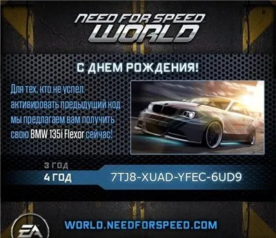 Для тех кто не успел активировать код на день рождение проекта Need for Speed World, был создан новый код