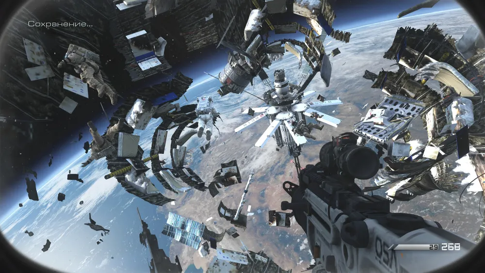 Бог с ним, c “хардом”, давайте посмотрим на “софт”: что там творцы из Infinity Ward приготовили? На первое у нас – кампания с хорошо знакомыми ингредиентами: перестрелками на каждом шагу, тонной пафоса, изобилием зрелищных сцен, тотальной линейностью и прямым как штык сюжетом. Разработчики из Infinity Ward решили идти своим путем, напрочь игнорируя интересные идеи, заложенные в Call of Duty: Black Ops II – праведном труде студии Treyarch, способном похвастаться массой положительных моментов: от относительной свободы в плане принятия решений и определенной доли нелинейности в момент прохождения до интересно реализованной механики ударных групп. Ничего подобного в Call of Duty: Ghosts нет – мы просто проходим миссию за миссией, палим во все стороны во славу США и демократии и периодически вдохновляемся зрелищами. Некоторые сценки, будь то падение высоченного небоскреба или разрушение города на наших глазах – они действительно впечатляют, как и некоторые миссии – особенно в рамках космической и подводной одиссей – целиком. Хотя присутствуют эпизоды, которые иначе как бредовыми не назовешь: покатушки на игрушечных “Абрамсах” со скоростью спортивного болида Себастьяна Феттеля к таковым относятся в полной мере.
