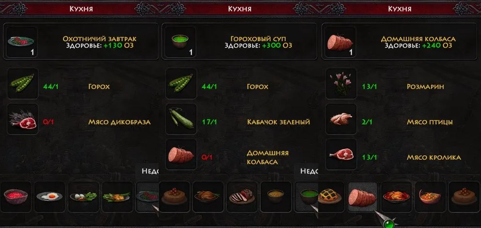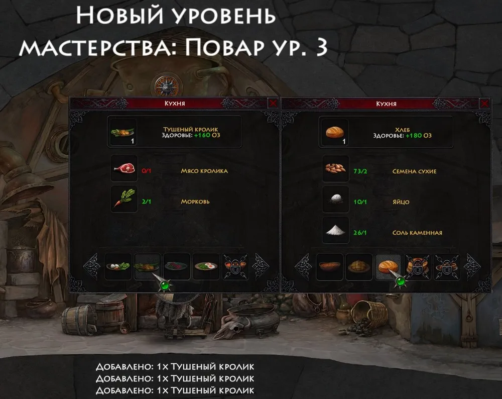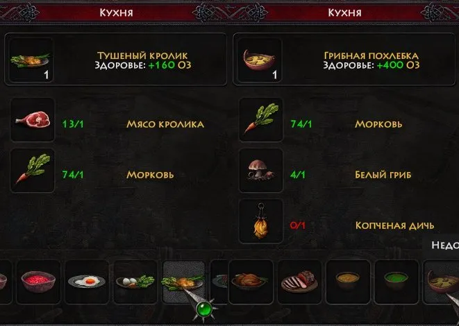 Кролик с морковью, особенно – если вы выращиваете морковь – очень неплохо. Грибная похлёбка: если повезёт, и белые грибы будут в продаже тоже пойдёт, во второй половине игры.