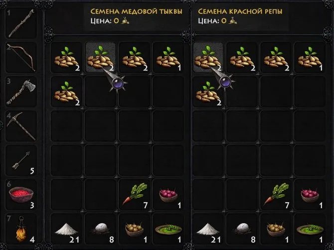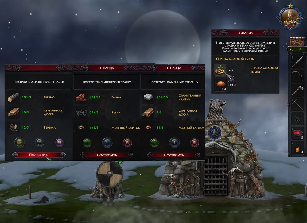 Однако яиц (для хлеба) не так много, кур и кроликов не добыть без стрел, остаётся надеяться на овощи, которые – вот сюрприз! - тоже не лежат грудами. Но в рюкзаке викинга после его пробежки по картам наверняка есть различные семена. Самые полезные на данном этапе семена медовой тыквы, хотя бы пара.