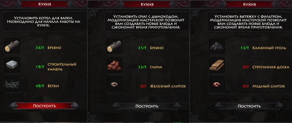 Можно приступать к строительству кухни третьего уровня, для чего понадобятся лесопилка первого и кузница второго.