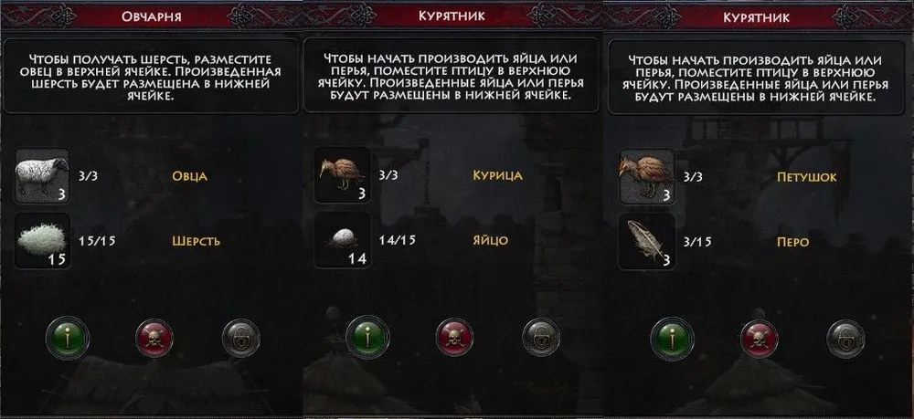 Сколько теплиц построить – две или одну? Я бы предпочёл несколько теплиц, пару курятников и овчарню. Теплицы дадут различные виды овощей, курятник с курами – яйца, с петухами – перья (стрелы); в овчарне получим шерсть (верёвки, доспехи).