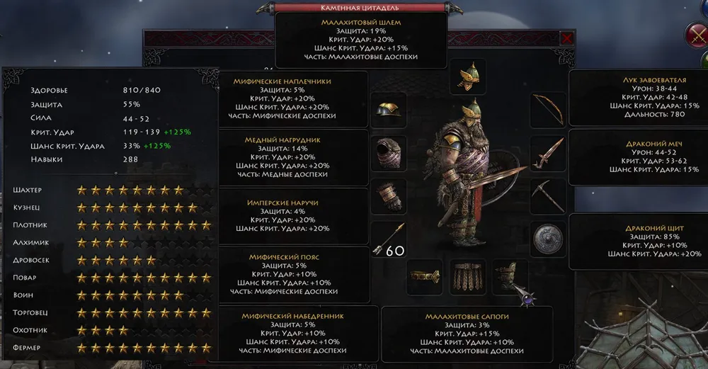 Изготавливая различные предметы снаряжения, вы можете видеть, какие именно бонусы даст тот или иной полный комплект.