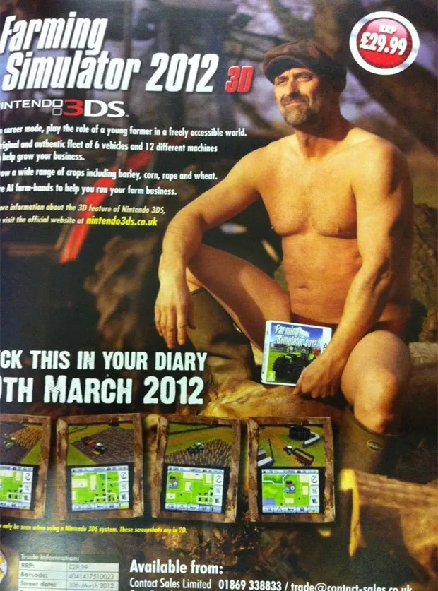 Несмотря на свой «семейный» имидж, компания Nintendo частенько заказывает для своих игр экстравагантную рекламу. Это традиция; старожилы помнят постер Game Boy с заигравшимся на пирсе персонажем, не заметившим, как акула откусила ему ноги. Чтобы продвинуть свою «веселую ферму» для 3DS — Farming Simulator 2012 — Nintendo наняла агентство (название определить не удалось), которое полагает, что почти обнаженный пожилой джентльмен вызовет позитивную реакцию аудитории («— Как игра-то называется? — Я запомнил: Gay Farm»).