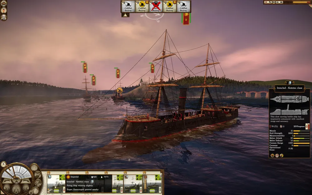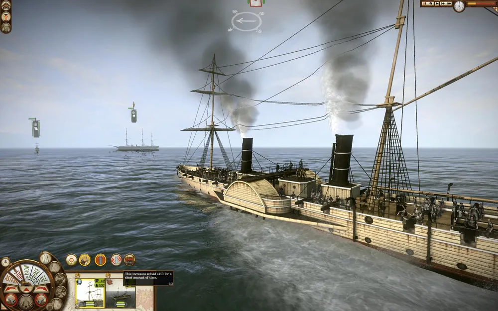 В арсенале каждого корабля - три типа боеприпасов: стандартные, взрывчатые (идеальны против деревянных судов), бронебойные (предназначены для борьбы с броненосцами). Кроме того, броненосцы могу таранить вражеские корабли.