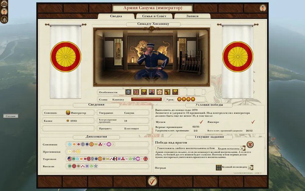 Попав в такой «дипломатический рай», я в ходе первой же кампании захватил всего 12 провинций и то лишь те, чьи хозяева не желали перевоспитываться и переходить на сторону моего сюзерена. Кампания была завершена в рекордные сроки - на 60 ходу (предел - 200); на все про все потребовалось 28 часов.