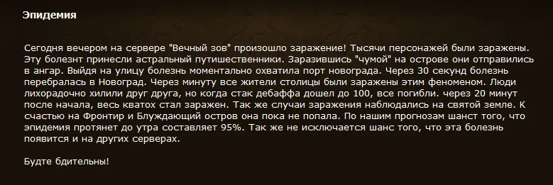 Подобных сообщений было около дюжины. Кто-то бился в истерике и предвещал апокалипсис в масштабах игровой вселенной, кто-то давал рекомендации по способам защиты от заразы, но были и такие, кто призывал разнести мор по всему миру, сформировав инфицированный рейд «Веселая Пандемия». Удалось ли собрать подобную группу мне достоверно не известно, но то, что зараза попала и на территорию Империи – факт непреложный.