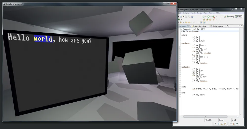 Самое смачное, бьющее наотмашь впечатление от Нотчевых заметок — то, до какой степени Маркус программист. Нотч вообще индустриально превалирует, потому что он фундаменталист и разрабатывает игры так, как если бы на дворе был 1988-й. Вводная к сюжету игры и манифест в пользу науки — короткие, спецификации 16-битного компьютера, который будет честно эмулироваться — длиннющие. Нотч уже разработал виртуальную клавиатуру и и виртуальный монитор. Возможно, мы что-то не так понимаем, но нам кажется, что это швед в шляпе хочет заставить нас всех управлять кораблями с помощью текстовых команд (точно-точно, и даже не команд, а целых программ — «Самые программно продвинутые из вас получают фору из-за спецификаций»). Также уже спрограммированы шейдеры и что-то сделано с освещением (point lights — это, наверное, звезды). Теперь идет работа над физикой персонажей (помните обещание реализовать в игре беготню по отсекам?), редактором моделей и рендерингом помещений.