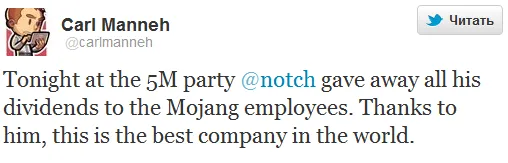 Да, именно так:Маркус Перссон отдал 3 миллиона долларов сотрудникам студии Mojang, о чем и сообщил 1 марта в своем твиттере: