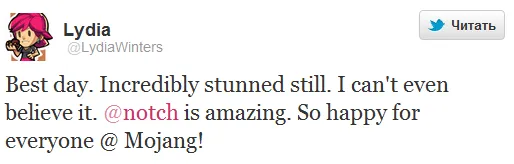 Лучший день. До сих пор не могу прийти в себя. Не могу даже поверить в это. @notch великолепен. Я так счастлива за всех в Mojang!