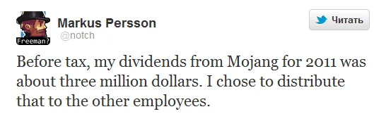 Без вычета налогов, мои дивиденды с Mojang за 2011 составили около трех миллионов долларов. Я решил раздать их остальным сотрудникам.