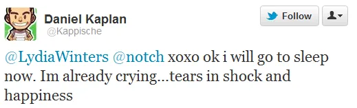 @LydiaWinters @notch xoxo ок, пойду-ка я спать. Я уже плачу... слезы шока и счастья.