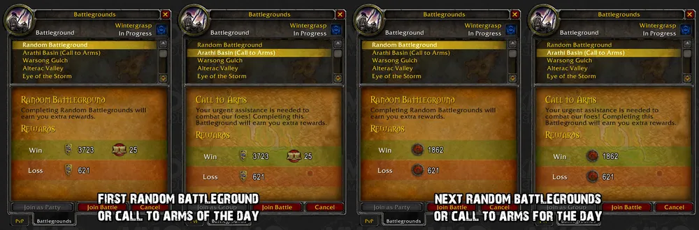 За первое выигранное поле боя в этот день игроки получат дополнительные 30 почетных убийств (Honorable Kill), за которые они получат дополнительные очки чести и 25 очков арены;