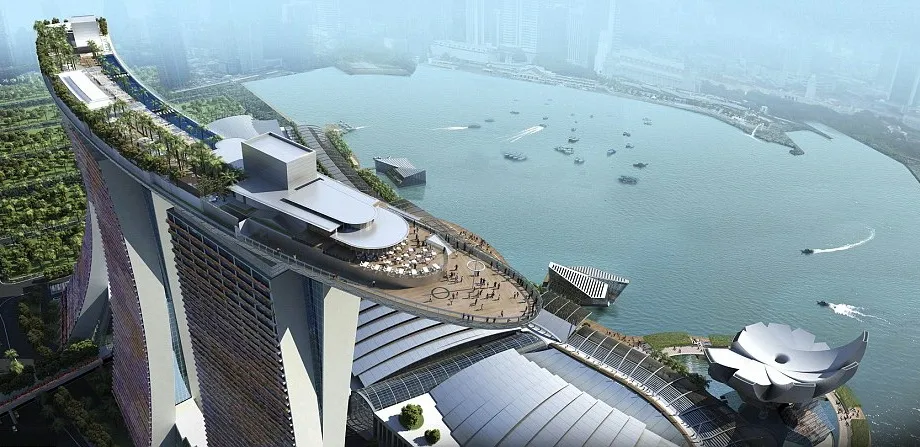 В Сингапуре состоится открытие курортно-гостиничного комплекса Marina Bay Sands. Три 55-этажных башни этого нового чуда света венчает трехпалубный корабль под названием "Небесный парк" площадью 12 400 кв.м. На его верхней палубе, на высоте 200 метров, расположен громадный 150-метровый бассейн с водопадом - самый большой бассейн под открытым небом, а также бары, рестораны и музей современного искусства. Издали создается впечатление, будто гигантский корабль возвышается над волнами на 200-метровой высоте.