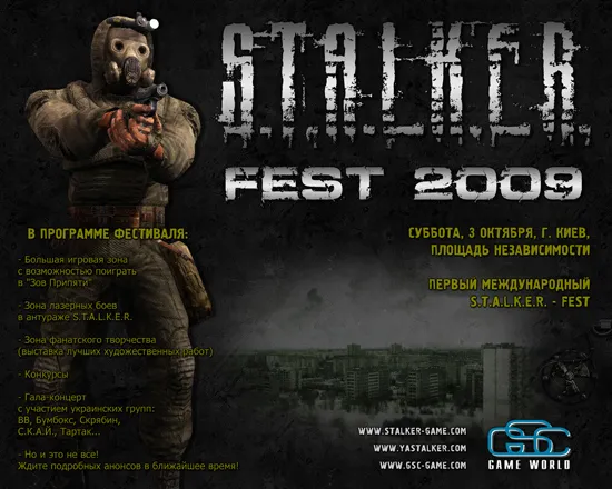 Итак, в программе фестиваля: большая игровая зона с возможностью поиграть в "Зов Припяти", зона лазерных боев в антураже S.T.A.L.K.E.R., зона фанатского творчества (выставка лучших художественных работ), конкурсы, а также гала-концерт с участием украинских групп ВВ, Бумбокс, Скрябин, С.К.А.Й., Тартак...