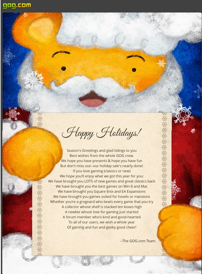 До Нового Года осталось всего ничего и вот поэтому, я решил предоставить вам в этом посте оставшиеся новогодние открытки от разработчиков и издателей (оставшиеся, потому что Mafiozo уже успел выложить пачку). Остальные открытки находятся по этому адресу.
